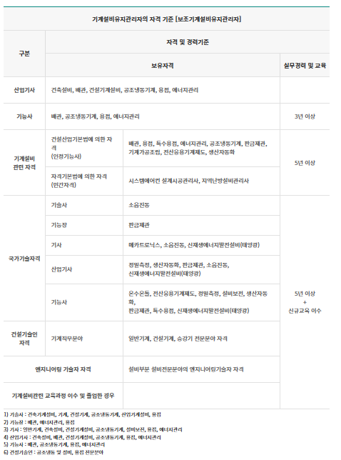 | NO | 기계설비유지관리자 선임대상 건축물 등 | 자격 및 경력기준 | 선임인원 |